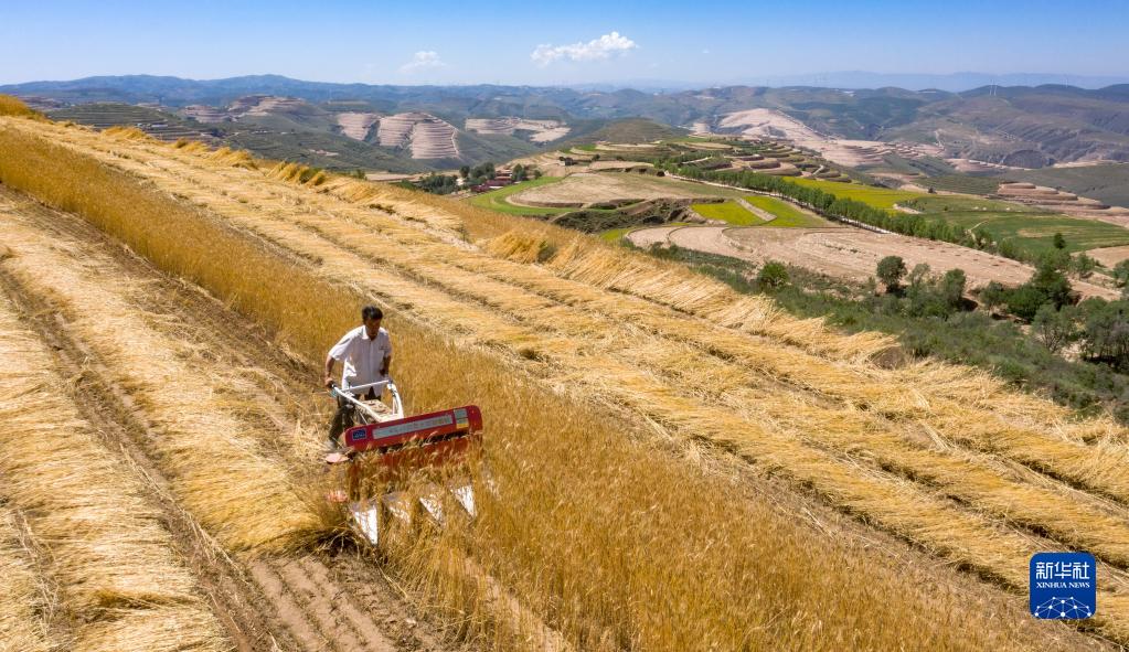 近日,寧夏西海固地區(qū)種植的冬小麥陸續(xù)進(jìn)入收割季節(jié)。旱塬、梯田上一片金黃,農(nóng)民操作著收割機(jī)械在其中忙碌。據(jù)了解,今年固原市夏糧面積42.89萬(wàn)畝,其中冬小麥36.04萬(wàn)畝。