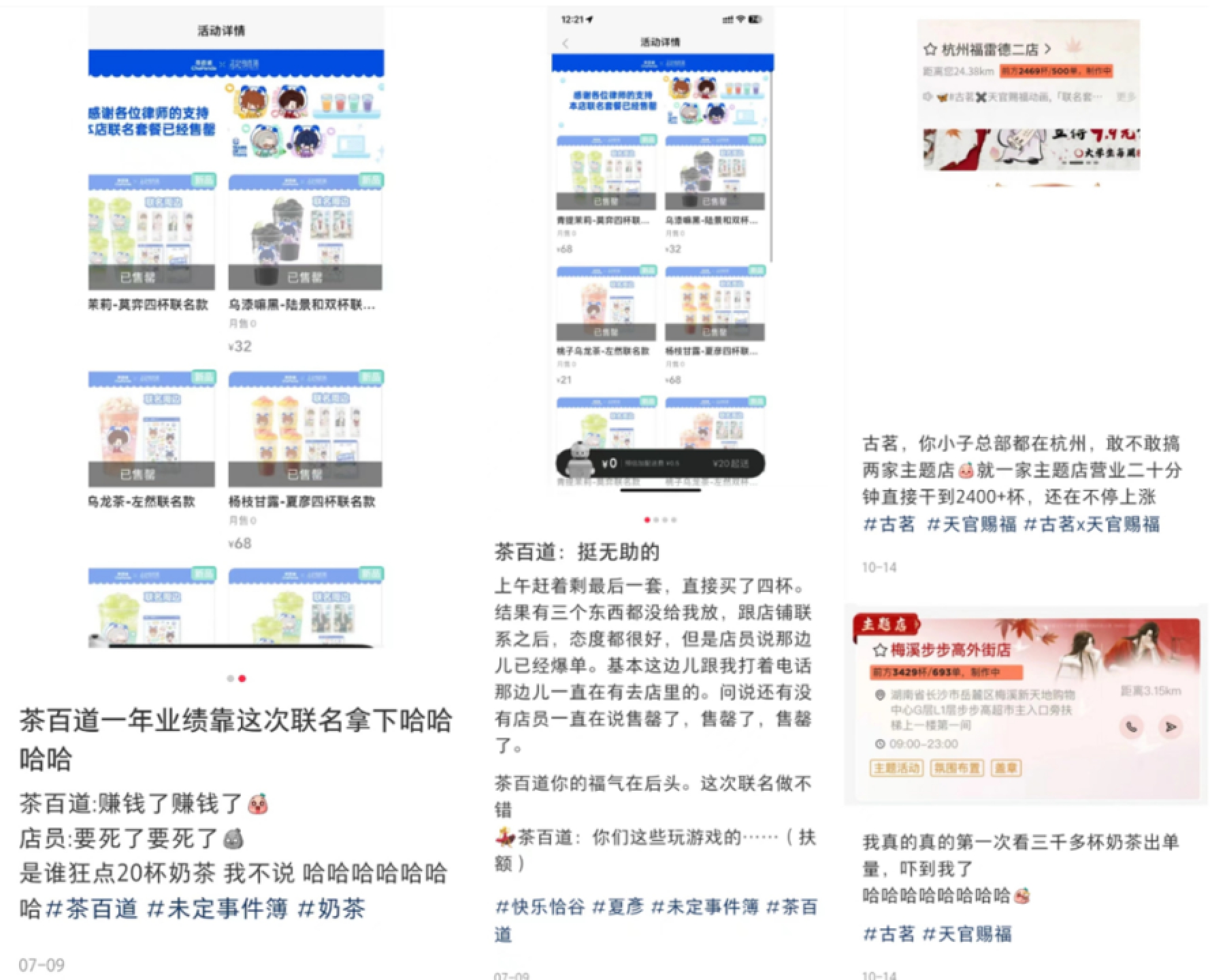 聯(lián)名在帶來(lái)高熱度的同時(shí)也讓茶飲店嘗到了爆單的甜頭。據(jù)網(wǎng)友在社交平臺(tái)分享,在茶百道與未定事件簿聯(lián)名活動(dòng)第一天,許多門(mén)店就已經(jīng)出現(xiàn)聯(lián)名套餐已售罄的標(biāo)識(shí);古茗與天官賜福聯(lián)名的線下主題店曾一度出現(xiàn)還有2000多杯甚至3000杯茶飲等待制作的現(xiàn)象。記者走訪了此前的聯(lián)名主題店,店員也回憶道:“當(dāng)時(shí)真的做不完!”