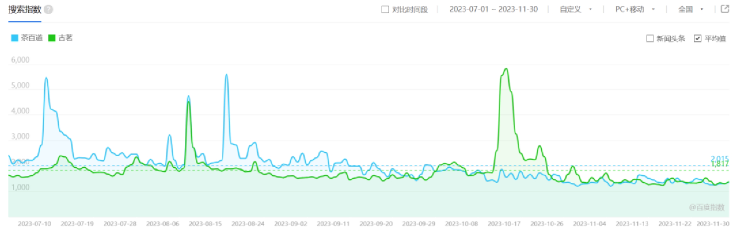 以“茶百道×未定事件簿”與“古茗×天官賜福”聯(lián)名活動(dòng)為例,截至11月30日,#茶百道聯(lián)名未定事件簿#、#古茗天官賜福#微博話題閱讀量分別達(dá)到1.6億、1.3億。根據(jù)百度指數(shù),在聯(lián)名活動(dòng)開(kāi)啟當(dāng)天,兩個(gè)茶飲品牌的搜索指數(shù)均出現(xiàn)顯著上升,皆超出今年7-11月平均值的150%以上。聯(lián)名活動(dòng)已然成為茶飲品牌的流量密碼。