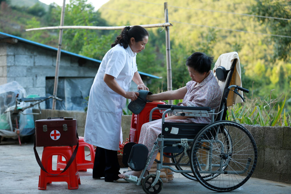 ↑貴州省黔南布依族苗族自治州貴定縣云霧鎮(zhèn)擺谷村,村醫(yī)羅海香(左)為一名行動(dòng)不便的村民測(cè)量血壓(8月16日攝)。