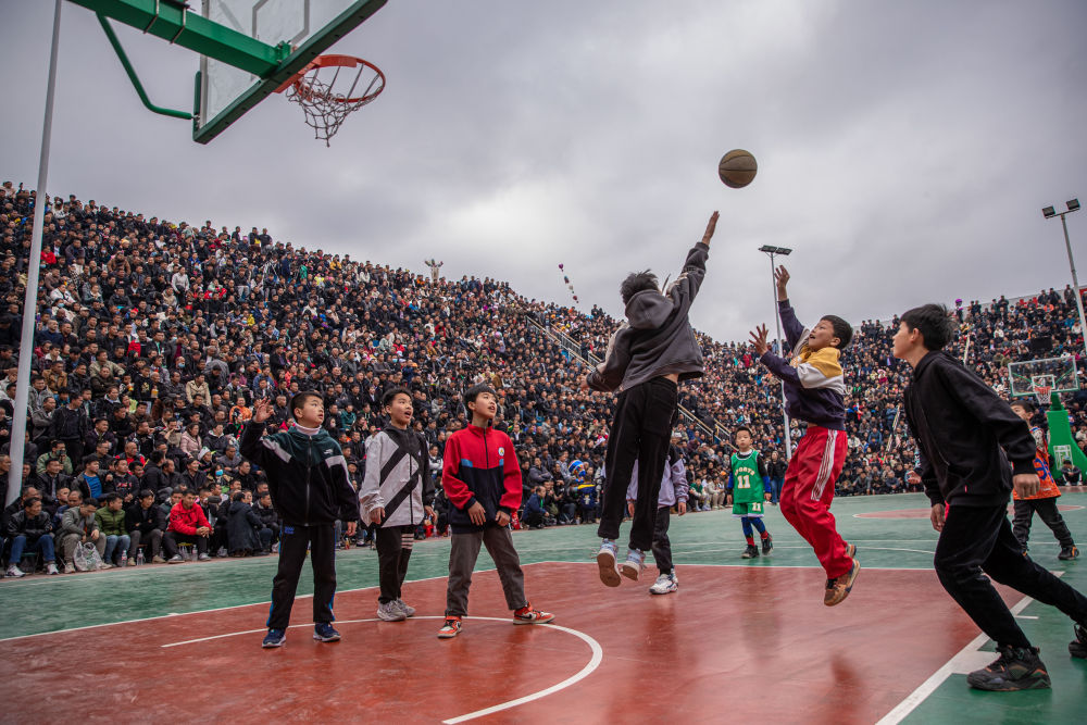 ↑貴州省黔東南州臺(tái)江縣臺(tái)盤村的小朋友在比賽前打籃球(3月25日攝)。當(dāng)日,貴州省首屆“美麗鄉(xiāng)村”籃球聯(lián)賽總決賽在臺(tái)盤村開打。