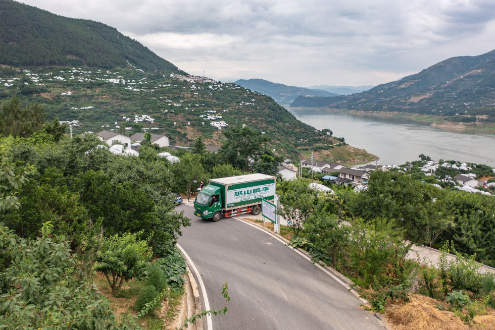 ↑重慶市巫山縣曲尺鄉(xiāng)柑園村,裝載有巫山脆李的中國(guó)郵政物流車行駛在村內(nèi)(無(wú)人機(jī)照片,6月28日攝)。過(guò)去因?yàn)槲锪鞑槐?,?jīng)過(guò)幾天的運(yùn)輸后,脆李的品質(zhì)和口感會(huì)受到影響?,F(xiàn)在,航空快遞的開通,讓巫山脆李快速走向全國(guó)。