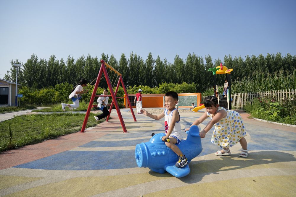 ↑孩子們?cè)诤颖笔√粕绞胸S南區(qū)趙新莊村一處游園內(nèi)玩耍(7月19日攝)。豐南區(qū)因地制宜實(shí)施美麗鄉(xiāng)村提升工程,通過(guò)改造農(nóng)村閑置破舊房屋、清理溝渠坑塘等措施,300余個(gè)行政村建起鄉(xiāng)村游園。
