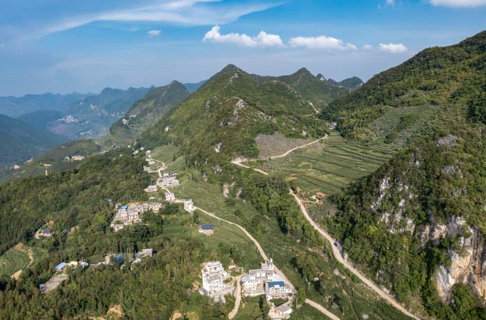 ↑云南省文山壯族苗族自治州西疇縣山間公路,右側(cè)這條是巖頭村村民小組長(zhǎng)李華明帶領(lǐng)群眾修建的最后一公里進(jìn)村道路(無(wú)人機(jī)照片,7月26日攝)。