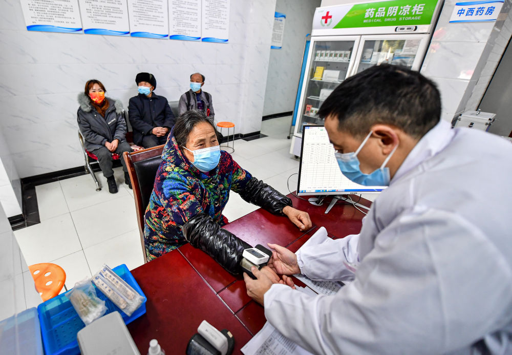 ↑四川省綿陽(yáng)市北川縣曲山鎮(zhèn)任家坪村、石椅村聯(lián)合衛(wèi)生室村醫(yī)趙太安(右一)在村衛(wèi)生室為前來(lái)問診的村民測(cè)量血壓(1月19日攝)。