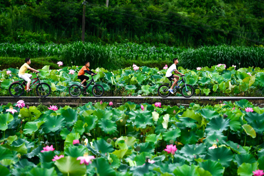 ↑孩子們?cè)谫F州省岑鞏縣客樓鎮(zhèn)下寨村騎行游玩(8月2日攝)。