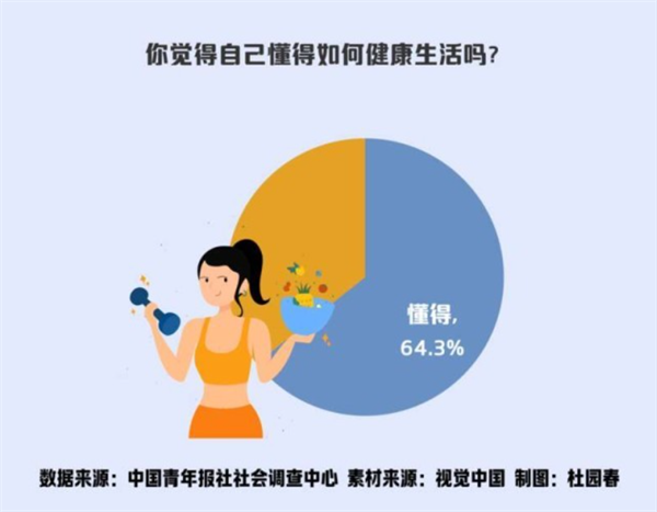 調(diào)查顯示,64.3%的受訪青年認為自己懂健康生活,35.7%的受訪青年表示“不懂”。進一步分析顯示,受訪青年所在城市級別越高,認為自己懂健康生活的比例越高,一線城市受訪青年的比例最高,為71.6%;上班族認為自己懂健康生活的比例(65.8%)略高于在校大學生(64.6%);隨著年齡的增長,受訪青年認為自己懂健康生活的比例越高,受訪85后最高,為67.2%,00后相對最低,為61.2%。