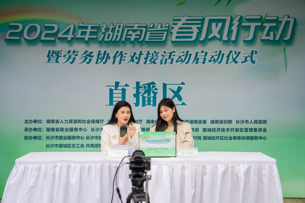 2月19日,在湖南省長沙市望城區(qū)市民廣場,工作人員在“春風行動”招聘活動上通過網(wǎng)絡直播推薦工作崗位。新華社記者 陳思汗 攝