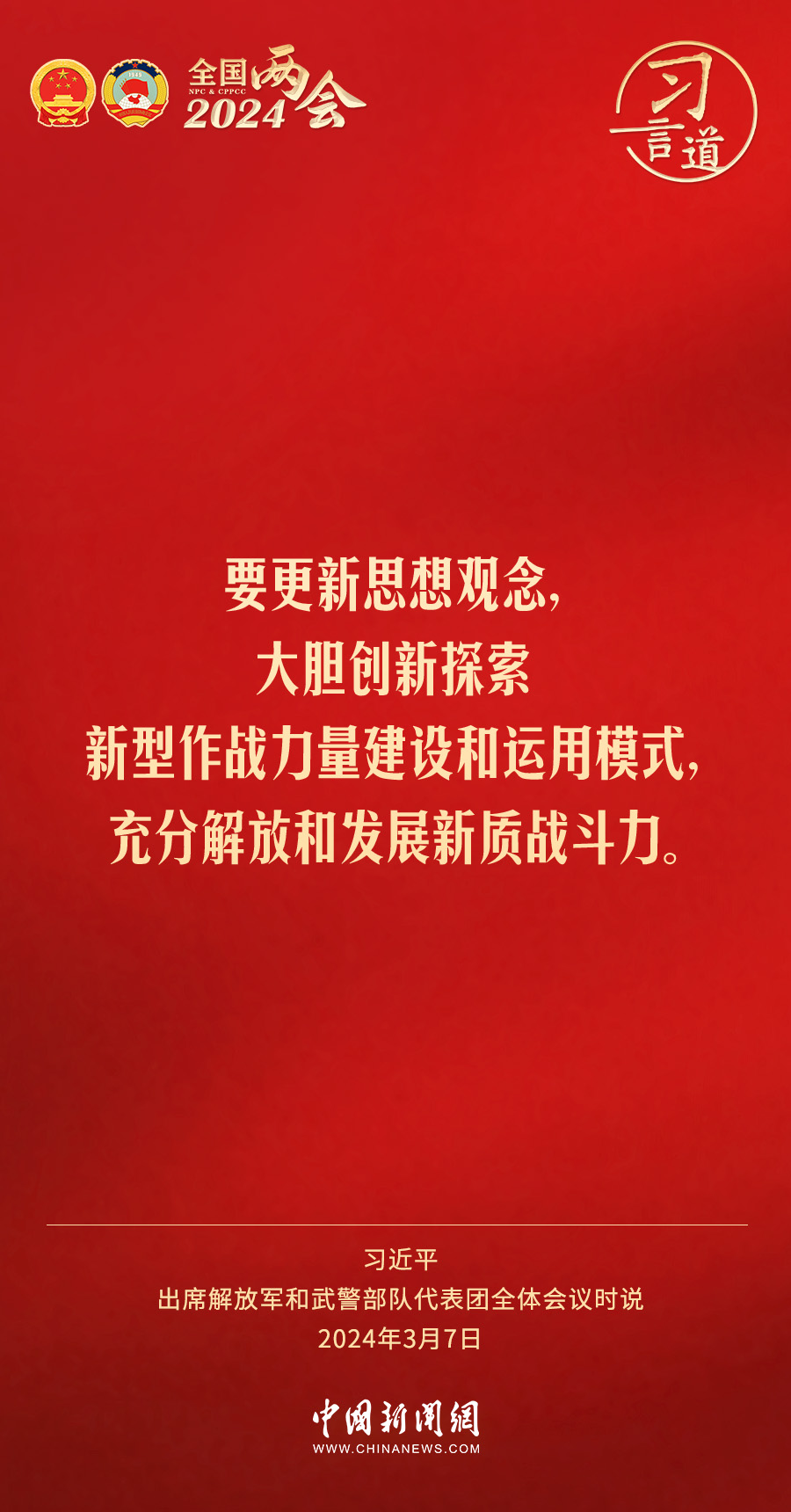 中共中央總書記、國家主席、中央軍委主席習近平7日下午出席十四屆全國人大二次會議解放軍和武警部隊代表團全體會議,習近平強調——