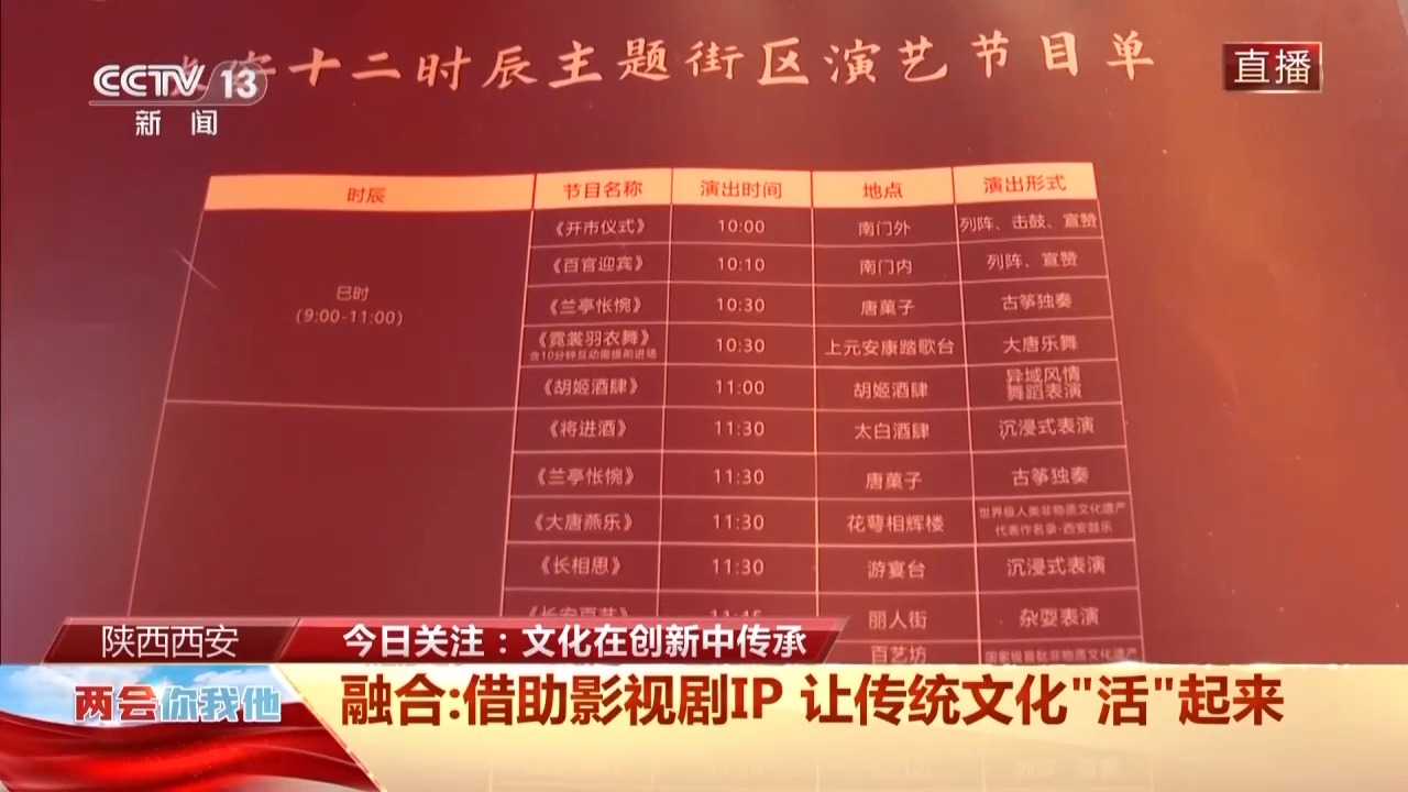 除了道具,這樣的一個(gè)主題街區(qū),小型互動表演遍布,這個(gè)節(jié)目單從早上10時(shí)的開市儀式一直到晚上10時(shí)的互動演繹,全天有70多場演出,旺季最多的時(shí)候有上百場演出。很多都是互動式的表演,比如太白酒肆里,李白的《將進(jìn)酒》一出,總會出現(xiàn)現(xiàn)場齊誦的熱烈場面。這個(gè)春天,五湖四海游客齊誦唐詩的場景,已經(jīng)成為西安的一道新風(fēng)景。